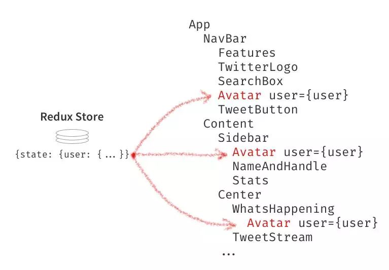 迟早你会陷入这类场景,顶级容器组件有一些数据,有一个 4 级以上的子组件需要这些数据。这有一个 Twitter 的例子,所有头像都圈出来了: