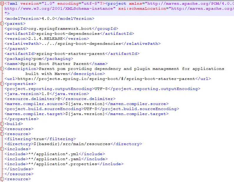 当我们创建一个 Spring Boot 项目后,我们可以在本地 Maven 仓库中看到看到这个具体的 parent 文件,以 2.1.4 这个版本为例,松哥 这里的路径是 C:\Users\sang\.m2\repository\org\springframework\boot\spring-boot-starter-parent\2.1.4.RELEASE\spring-boot-starter-parent-2.1.4.RELEASE.pom ,打开这个文件,快速阅读文件源码,基本上就可以证实我们前面说的功能,如下图: