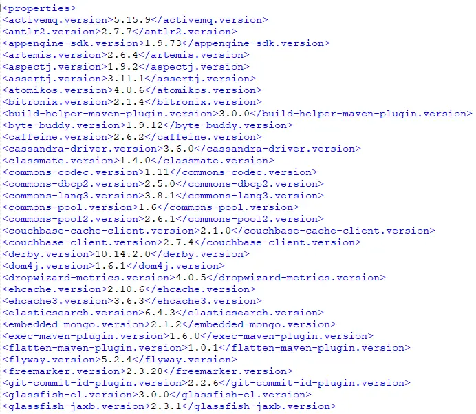 我们可以看到,它继承自 spring-boot-dependencies ,这里保存了基本的依赖信息,另外我们也可以看到项目的编码格式,JDK 的版本等信息,当然也有我们前面提到的数据过滤信息。最后,我们再根据它的 parent 中指定的 spring-boot-dependencies 位置,来看看 spring-boot-dependencies 中的定义: