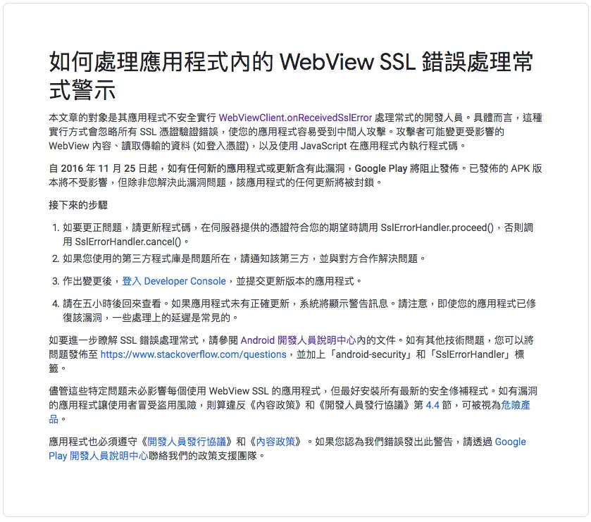 Google Play应用市场提交应用审核,出现因WebViewClient.onReceivedSslError问题导致拒绝通过。