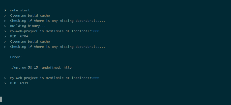 现在我们得到一个 watch 命令,它在项目目录中以递归方式监视更改,不包括 vendor 目录。我们可以直接传递我们想要的任何运行命令。例如, start 命令基本上在代码更改时调用 make compile start-server: