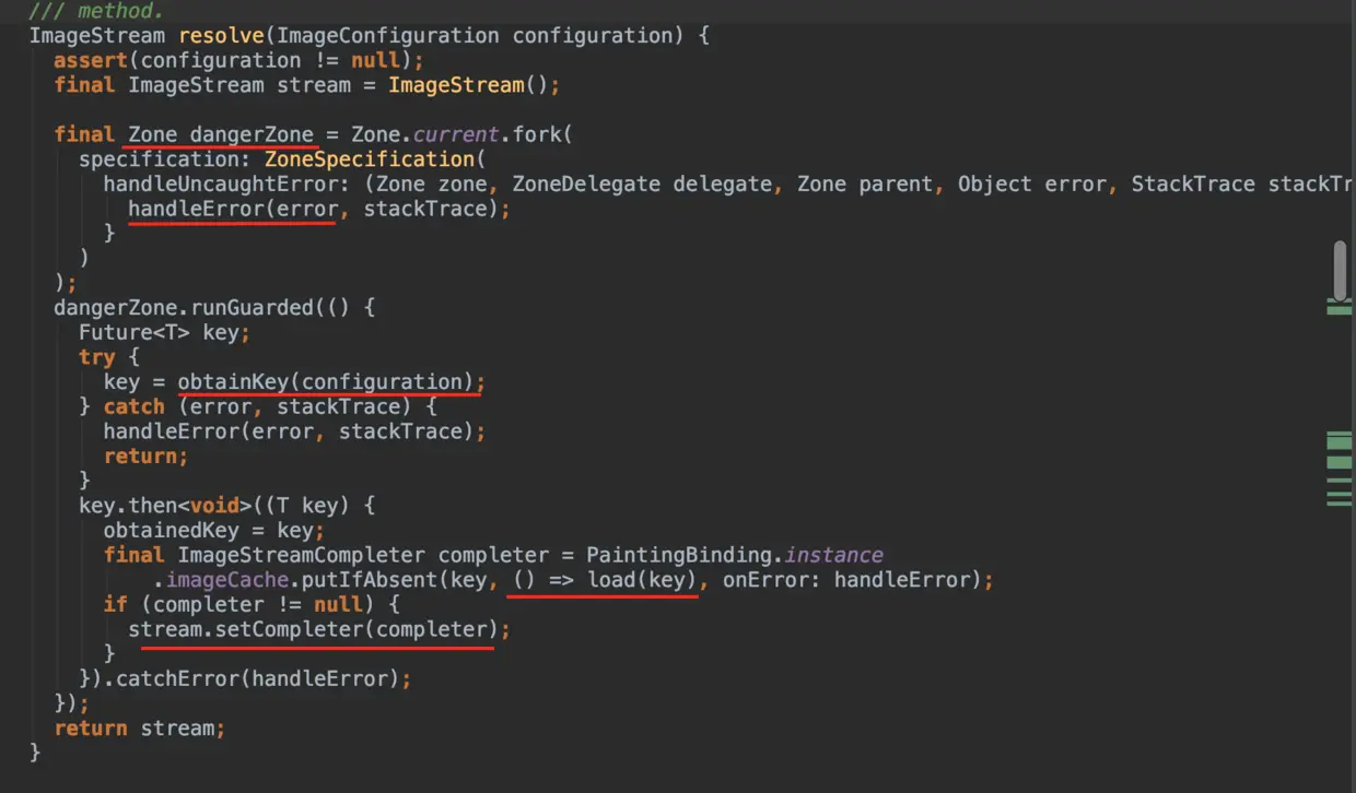 ImageProvider 的关键在于 resolve 方法,从流程图我们可知,该方法在 Image 的生命周期回调方法 didChangeDependencies 、 didUpdateWidget 、 reassemble 里会被调用,从下方源码可以看出,上面我们所实现的 obtainKey 和 load 都会在这里被调用