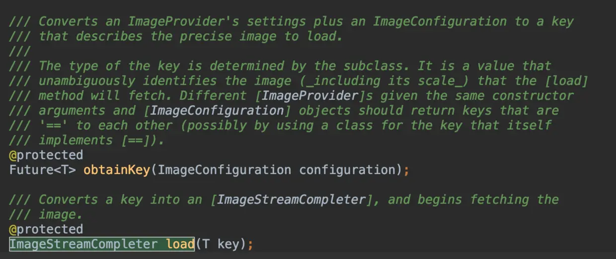 load 方法返回的是 ImageStreamCompleter 抽象对象,它主要是用于管理和通知 ImageStream 中得到的 dart:ui.Image ,比如在 NetworkImage 中的是子类 MultiFrameImageStreamCompleter , 它可以处理多帧的动画,如果图片只有一针,那么将执行一次都结束。