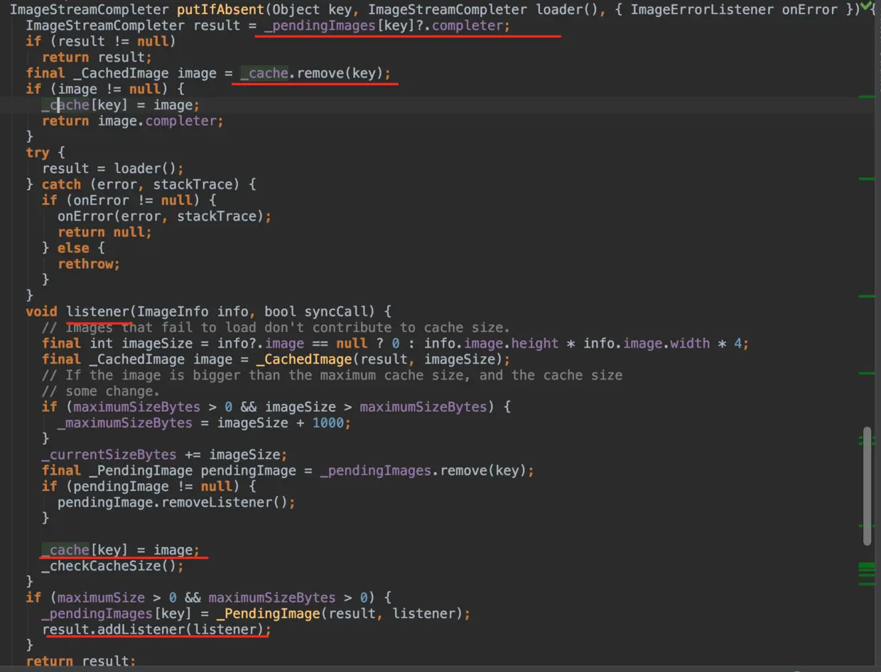 值得注意的是,此时的的 cache 是有两个状态的,因为返回的 ImageStreamCompleter 并不代表着图片就加载完成,所以如果是首次加载,会先有 _PendingImage 用于标示该key的图片处于加载中的状态 ,并且添加一个 listener, 用于图片加载完成后,替换为缓存 _CacheImage 。