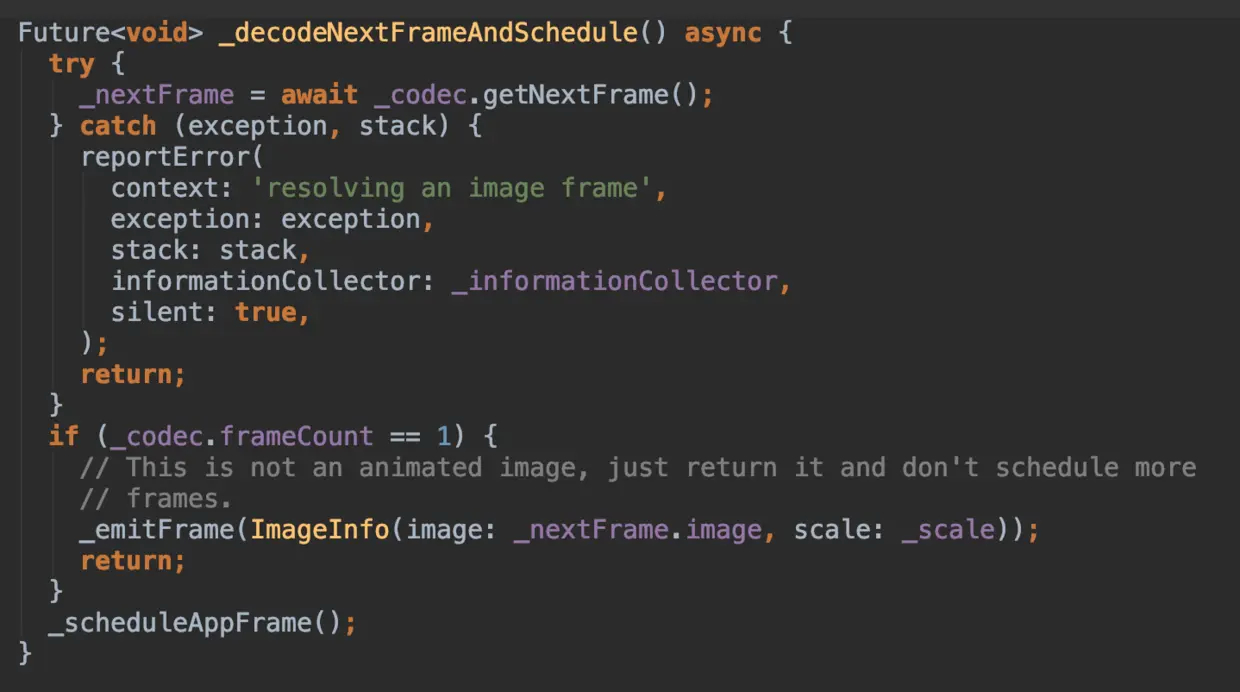 接下来我们看 NetworkImage 中的 ImageStreamCompleter 实现类 MultiFrameImageStreamCompleter 。如下图代码所示,MultiFrameImageStreamCompleter 主要通过 codec 参数获得渲染数据,而这个数据来源通过 _loadAsync 方法得到,该方法主要通过 http 下载图片后,对图片数据通过 PaintingBinding 进行 ImageCodec 编码处理,将图片转化为引擎可绘制数据。