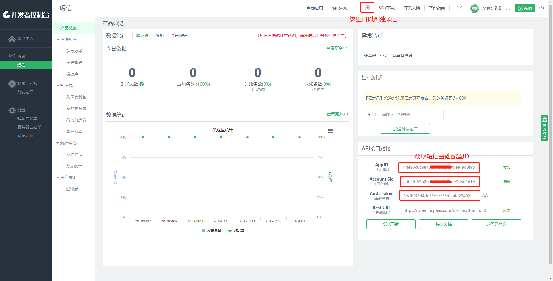 创建平台项目后可以获得短信基础配置,在调用短信接口时使用