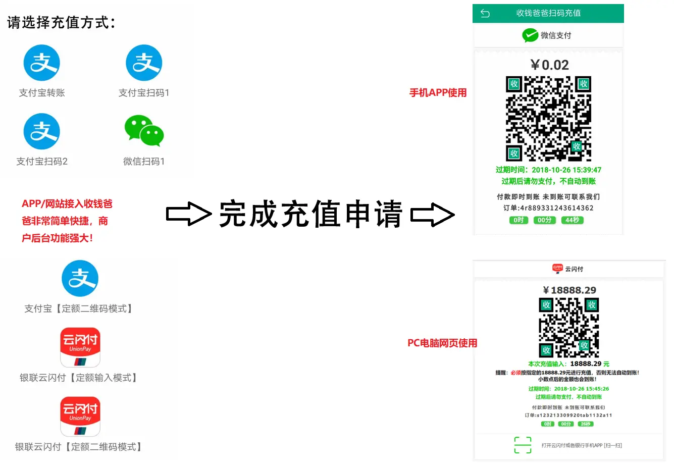 充值申请接口:调用成功后,将会获得一个二维码支付页地址。