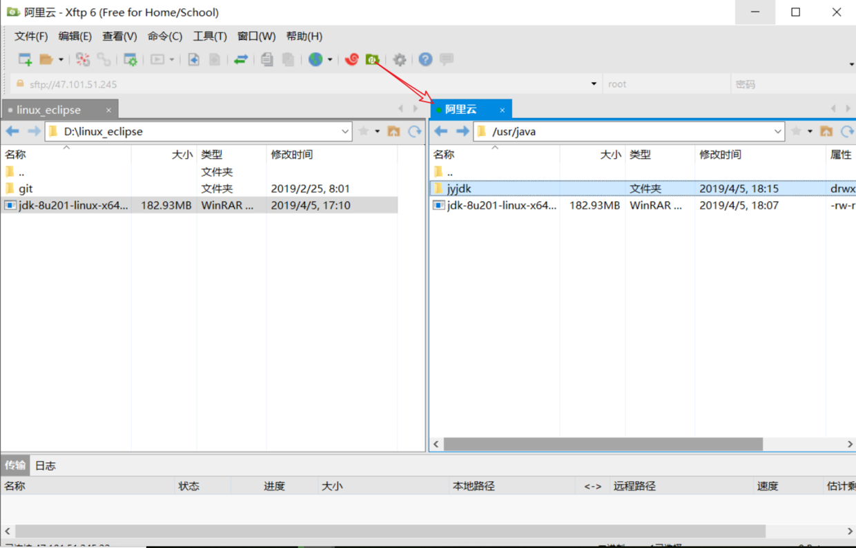 Xshell 6用公网IP和密码连接到阿里云, 然后点击:窗口--->传输新建文件(我已安装有Xftp 6) 在/usr下新建名为java的文件夹,从本地传输jdk的压缩包到java文件夹,再创建一个子文件夹名为jyjdk