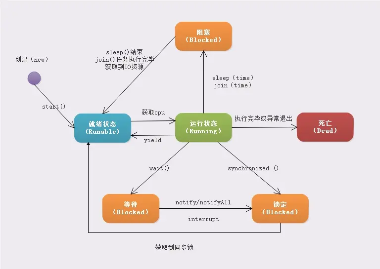 下图为线程的生命周期以及状态转换过程