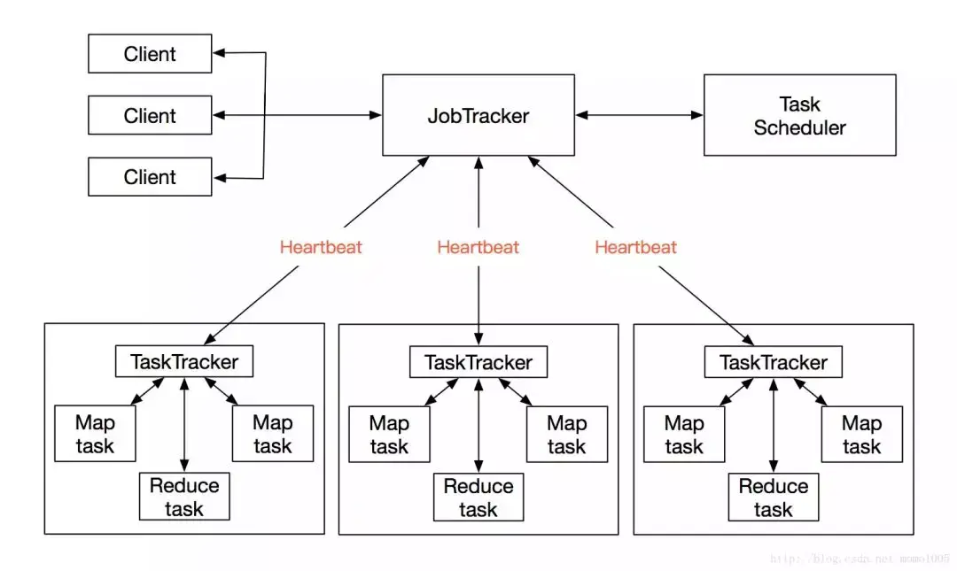 Hadoop1.x时,MapReduce的架构仍然是主从架构。一个JobTracker带多个TaskTracker,主节点为JobTracker,只有一个,从节点为TaskTracker,可以有多个,从节点通过向主节点发送心跳信息(heartbeat)来告诉它自己的运行情况,而主节点则是负责管理调度的工作。