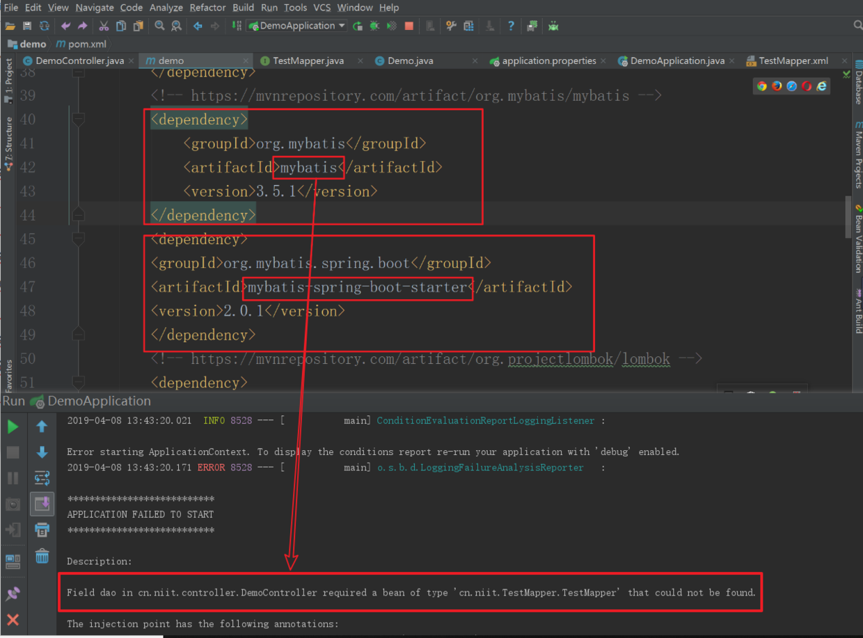 Field dao in cn.niit.controller.DemoController required a bean of type'cn.niit.TestMapper.TestMapper' that could not be found.