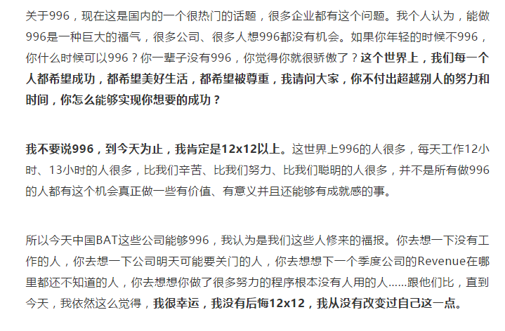 对于996,有很多成功的互联网大佬也非常的支持996,笔者认为,一个观点,总会有赞同他的一面,也会有争议的一面。那是因为自己所处的环境很可能决定了你的想法和观点