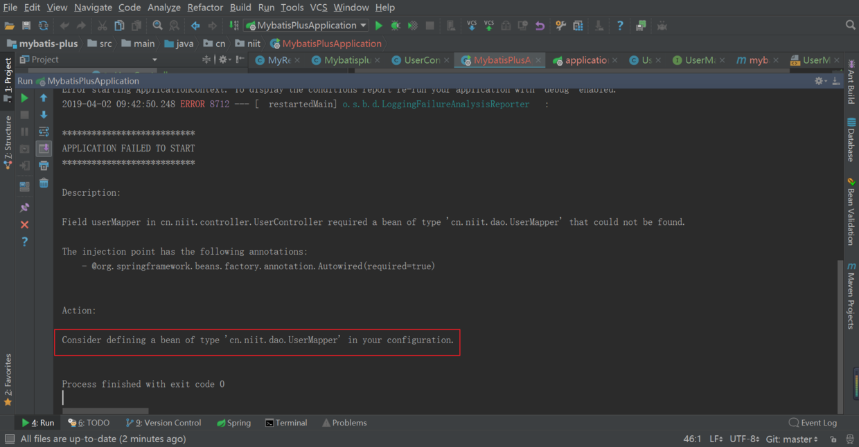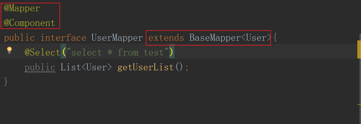 UserMapper.java接口加上@Mapper这个注解,@Component不加时自动注入时变量报红但似乎并不影响运行(难道是我idea的问题?)