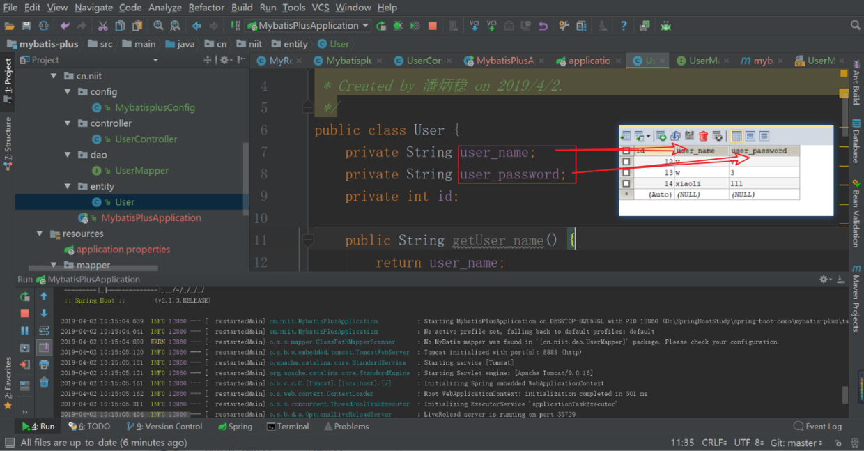 扫描接口 实体类变量要跟表的字段一致,没单独配置一一映射关系 加入的依赖是mybatisplus-spring-boot-starter