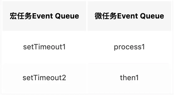 - 首先输出2。接下来遇到了process.nextTick(),同样将其分发到微任务Event Queue中,记为process2。new Promise立即执行输出4,then也分发到微任务Event Queue中,记为then2。