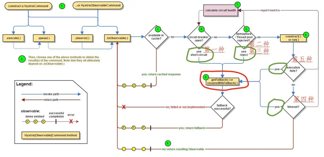 - 红圈 :Hystrix 命令执行失败,执行回退逻辑。也就是大家经常在文章中看到的“服务降级”。