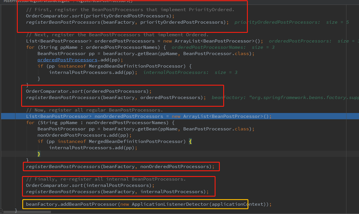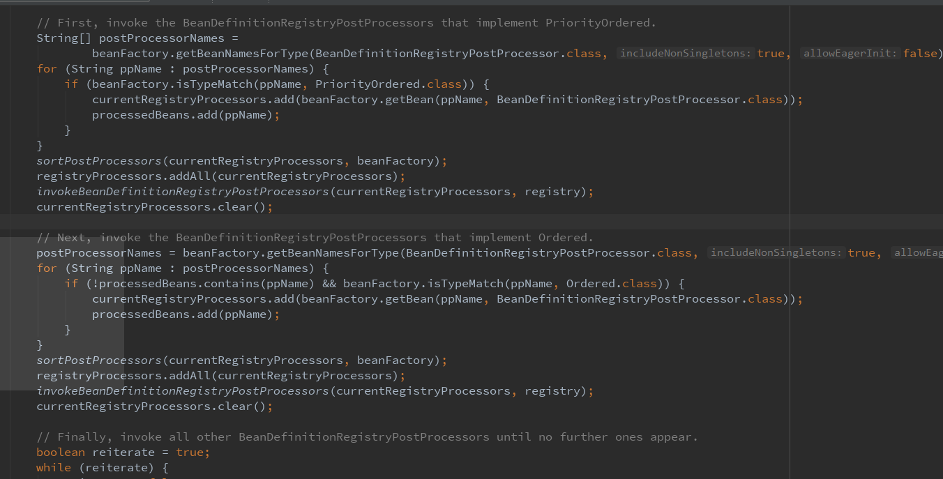 依次执行实现了PriorityOrdered、Ordered接口和没有实现它们的 processor postProcessor.postProcessBeanDefinitionRegistry(registry)