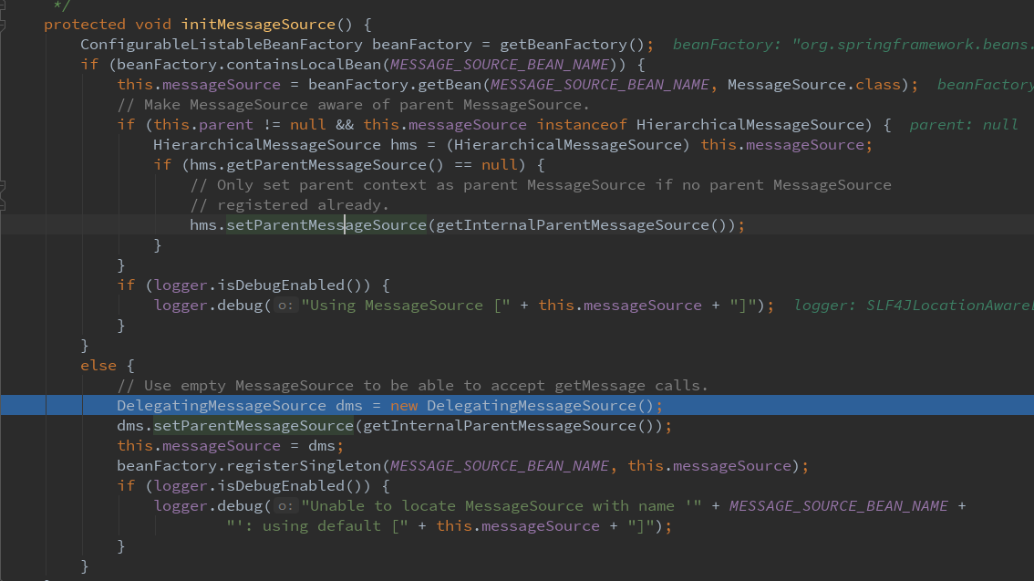 有->this.messageSource = beanFactory.getBean(MESSAGE_SOURCE_BEAN_NAME, MessageSource.class)