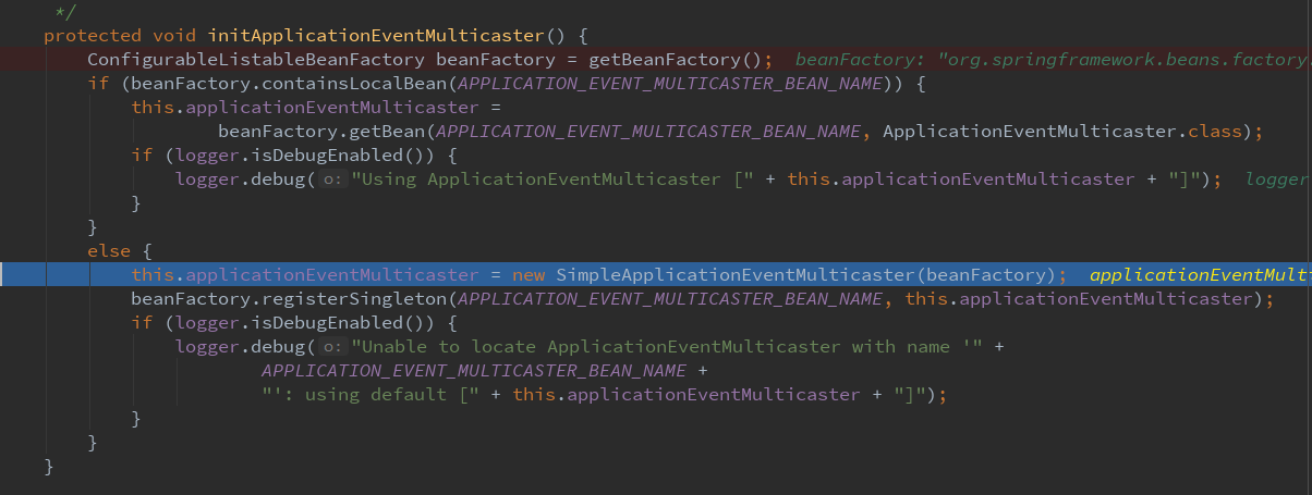 有->this.applicationEventMulticaster beanFactory.getBean(APPLICATION_EVENT_MULTICASTER_BEAN_NAME, ApplicationEventMulticaster.class)