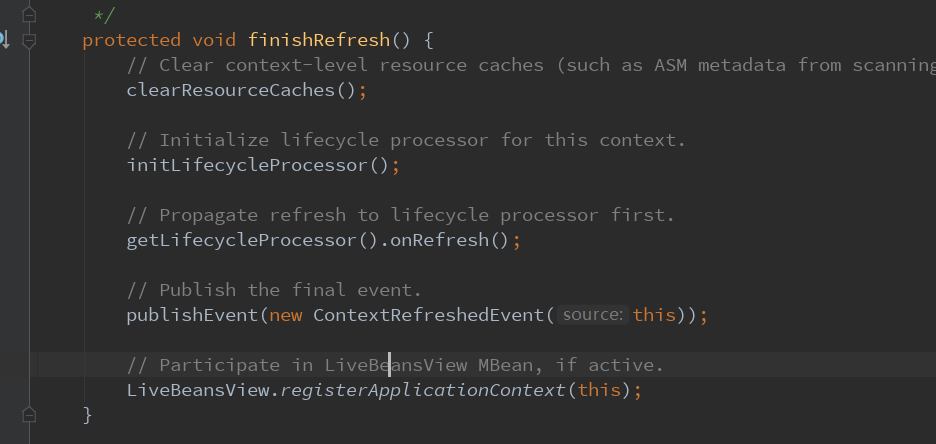 publishEvent(new ContextRefreshedEvent(this)) - 调用LiveBeansView的registerApplicationContext方法:如果设置了JMX相关的属性,则就调用该方法 LiveBeansView.registerApplicationContext(this)