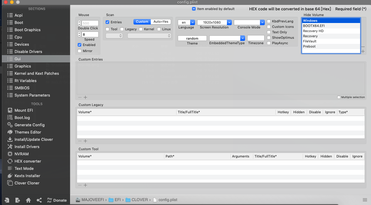 - 加载苹果 EFI分区,删掉 EFI>CLOVER>themes 目录,将包含主题的themes文件夹拷贝进去,修改Gui>Theme为random