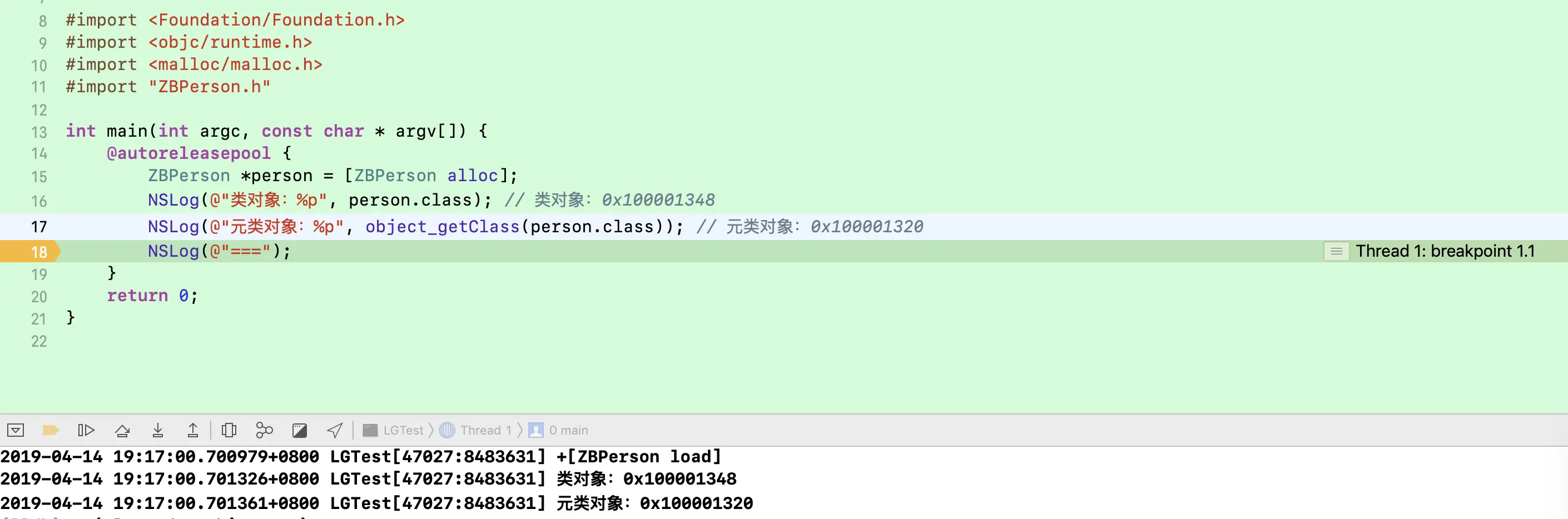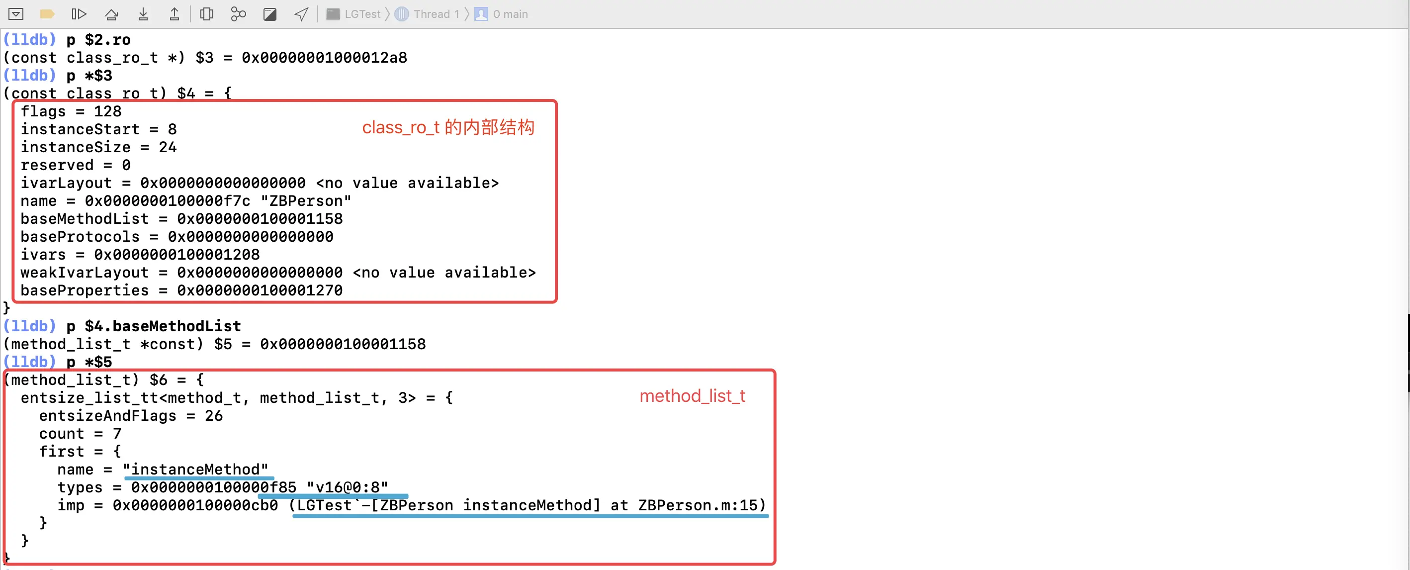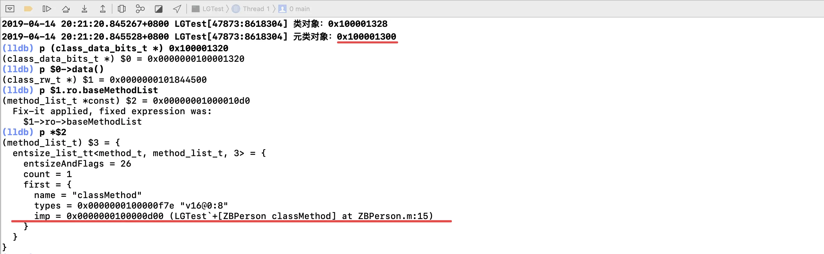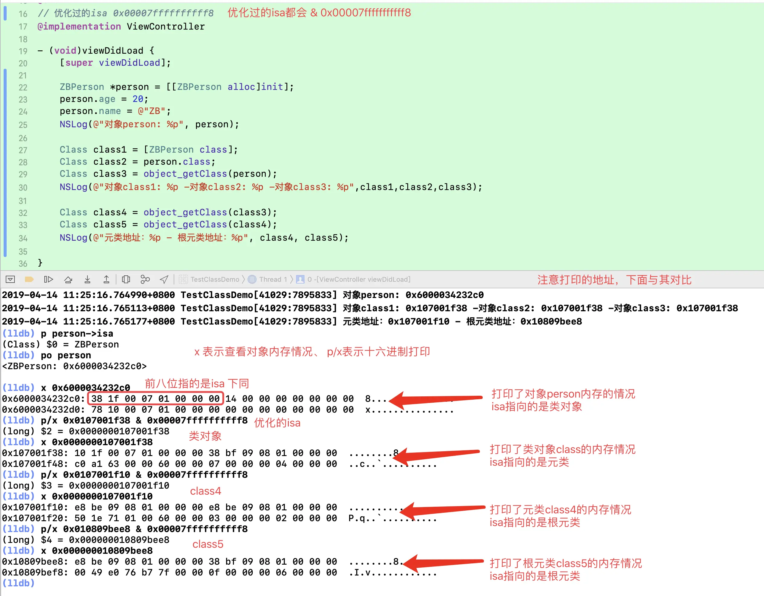 person->isa输出了person对象的isa的指向,是ZBPerson这个类,地址是0x6000034232c0,调试的输出的结果和打印输出的结果一致 - 用命令