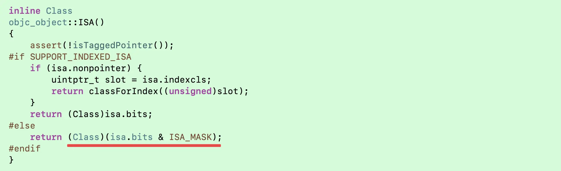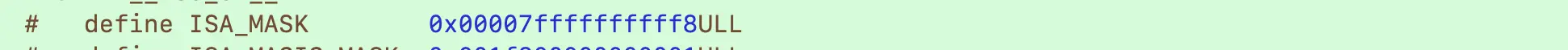 isa为优化过的,每次打印输出的时候,都&上了一个值0x00007ffffffffff8,这又是从哪里得出来的结论呢?请看下面源码: