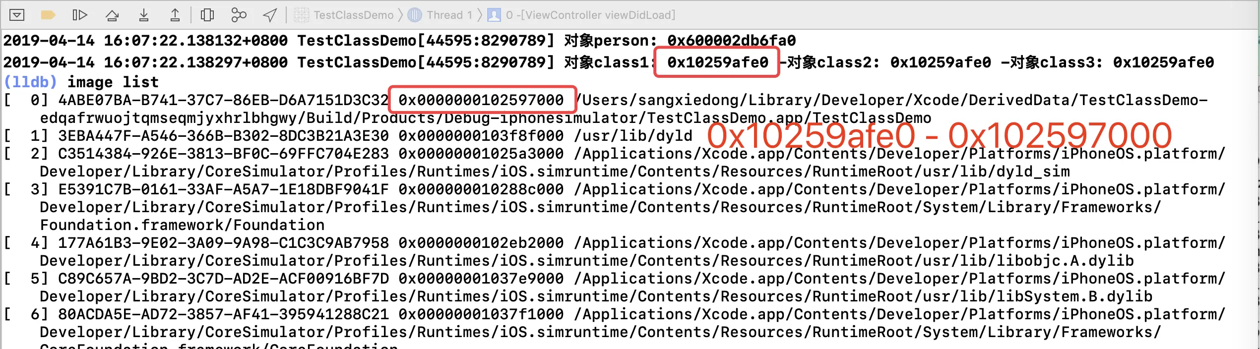 然后打印出当前类的地址,通过image list找到首地址,通过计算器算出偏移量