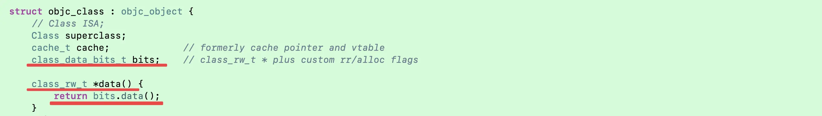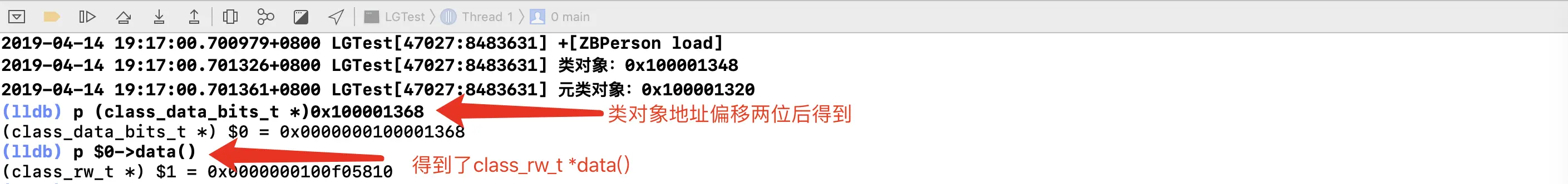 class_rw_t *data(),就需要知道class_data_bits_t bits,而要知道class_data_bits_t bits,我们就需要通过类对象的地址进行指针偏移来获得。8字节+8字节+16字节--->移2位便能获取到class_data_bits_t bits。