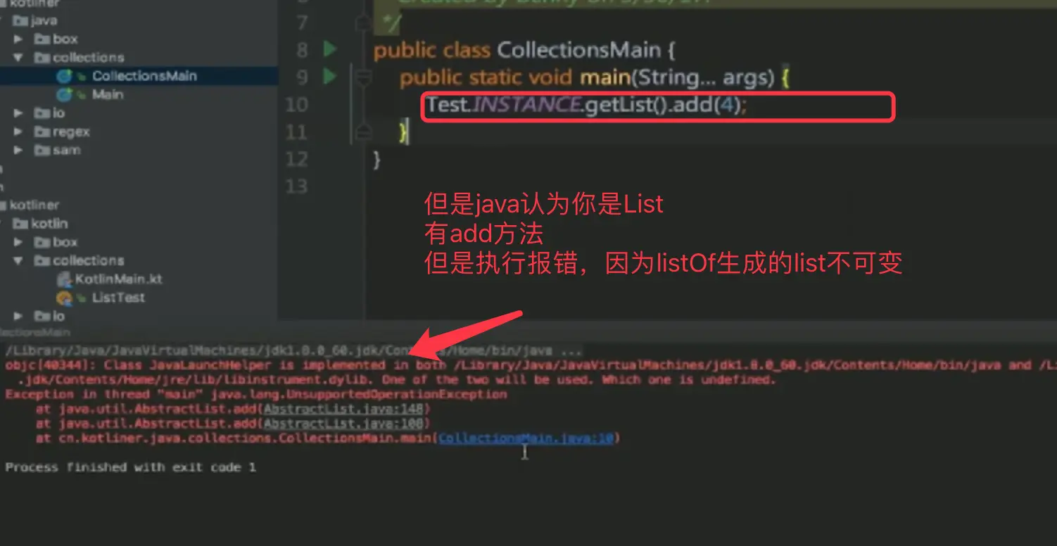 java认为kotlin listOf定义的list与普通list没区别,支持调用add remove ,但是实际运行会报错