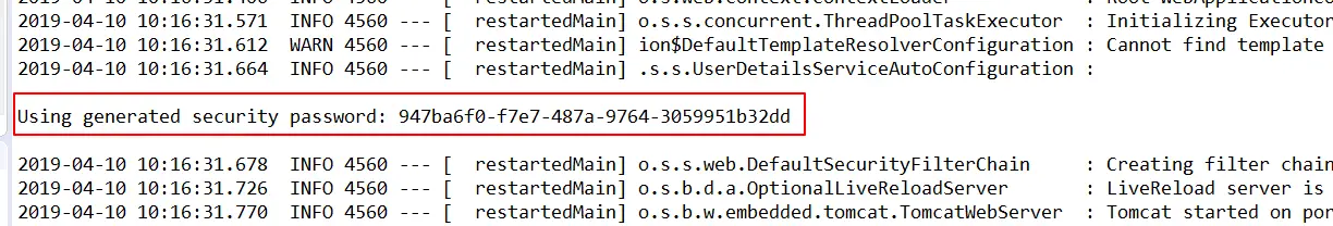 当然是 spring-security 进行了默认控制,从启动日志中,可以看到一串用户名默认为user的默认密码: