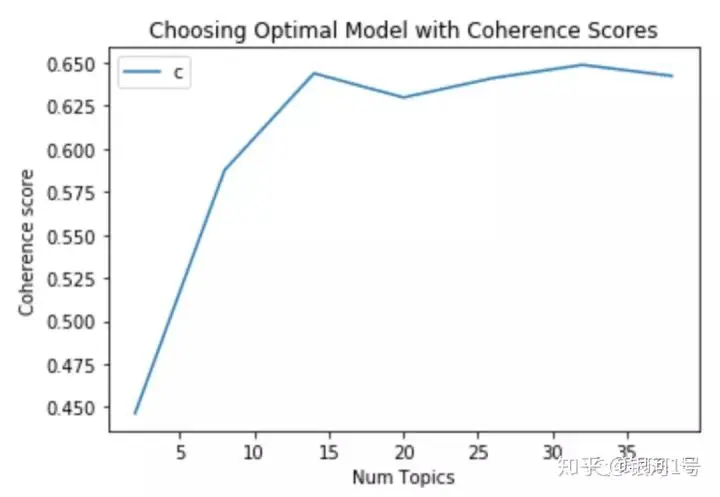Num Topics = 2 has Coherence Value of 0.4451Num Topics = 8 has Coherence Value of 0.5943Num Topics = 14 has Coherence Value of 0.6208Num Topics = 20 has Coherence Value of 0.6438Num Topics = 26 has Coherence Value of 0.643Num Topics = 32 has Coherence Value of 0.6478Num Topics = 38 has Coherence Value of 0.6525如果相关性得分似乎在不断增加,那么选择在展平之前给出最高CV的模型可能更有意义。这就是这种情况。