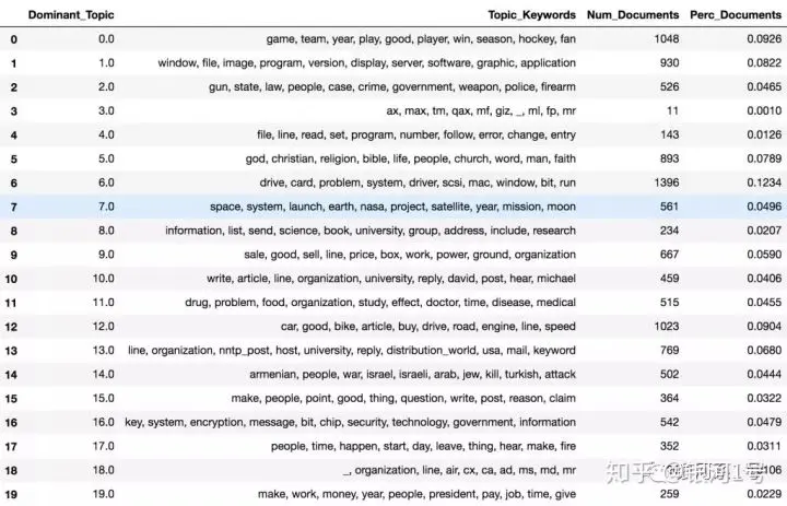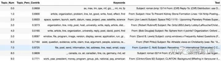 上面的表格输出实际上有20行,每个主题一个。它有主题编号,关键字和最具代表性的文档。该Perc_Contribution列只是给定文档中主题的百分比贡献。