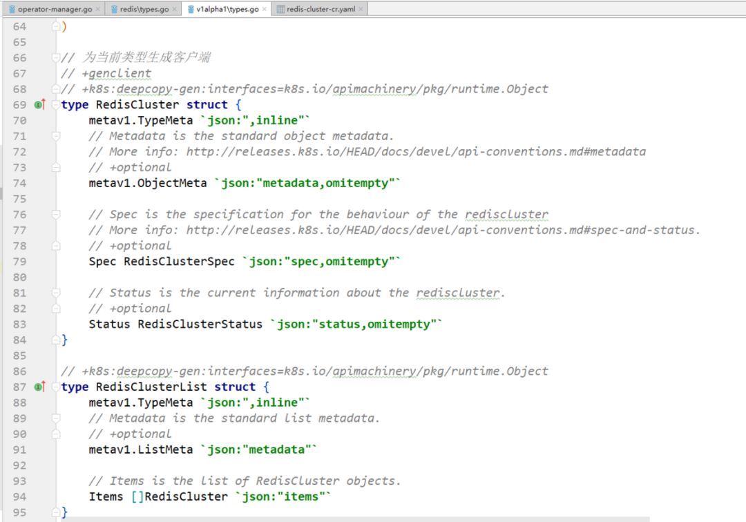 准备一个CR yaml文件,后面operator代码要根据该yaml结构在types.go中定义结构体。redis的CR yaml如下。operator最终会监听该CR,解析里面定义的节点数、版本号等参数,驱动做一些事情。