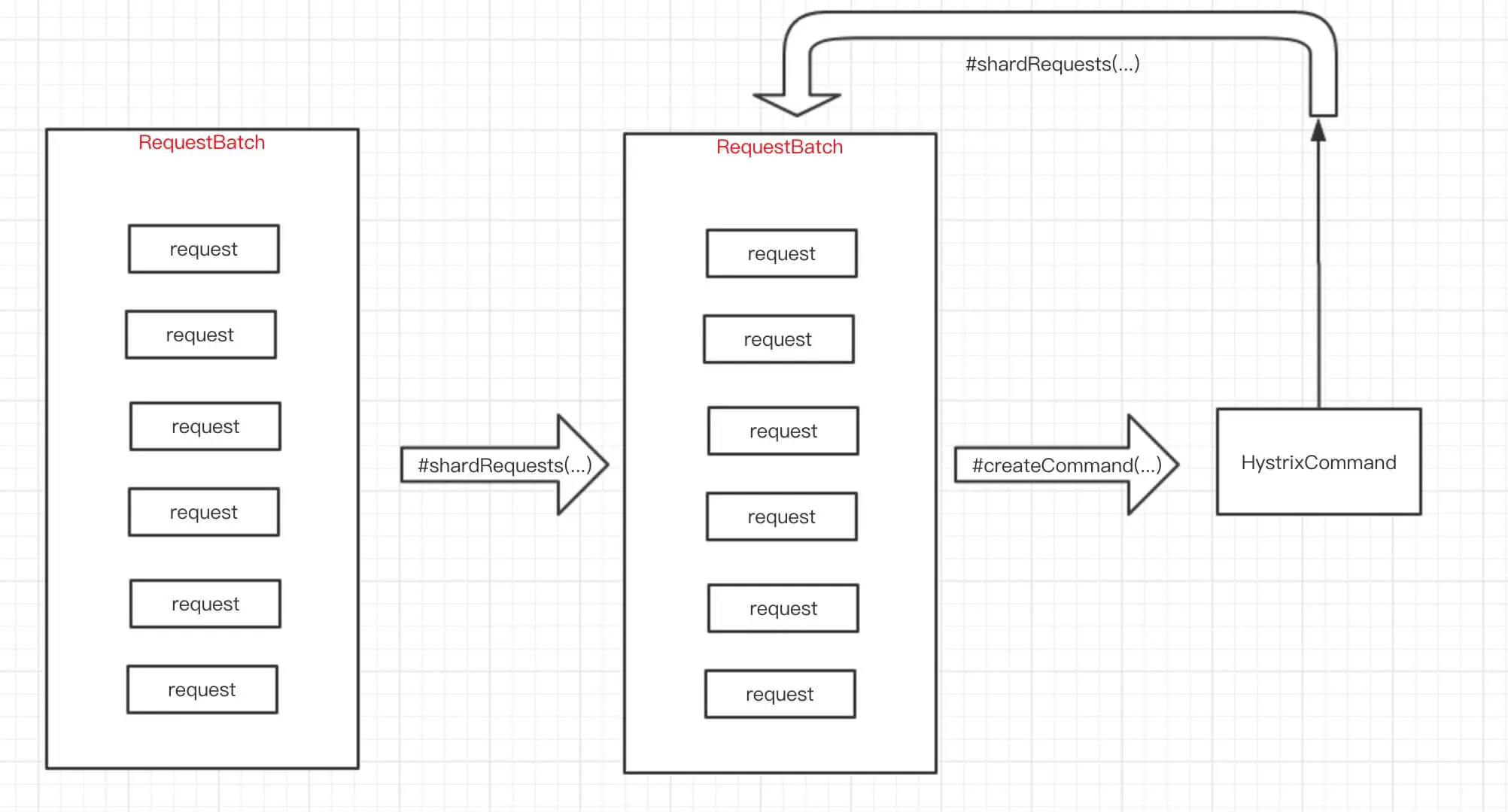HystrixCollapserBridge#shardRequests(...)方法,将多个命令请求分片成 N 个【多个命令请求】。默认实现下,不进行分片。点击 链接 查看代码。 - 第 17 行 :循环 N 个【多个命令请求】。