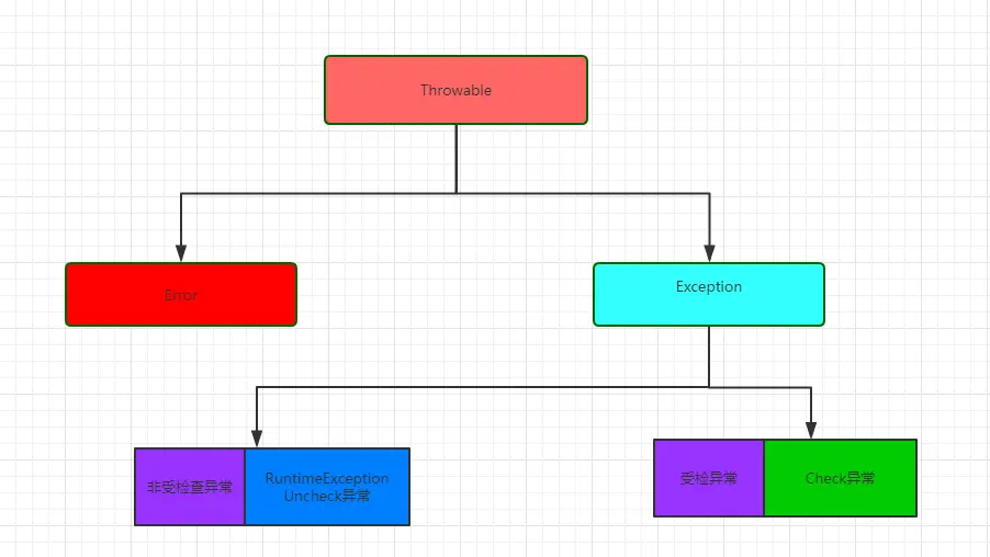 在JDK中,Throwable是所有异常的父类,其下分为”Error“和”Exception“。Error意味着出现了不可控的严重错误,例如OutOfMemoryError。Exception则细分为两类,受检异常(check)需要我们手动try/catch或者在方法定义中throws,编译器在编译的时候会检查其合法性。非受检异常(uncheck)则不需要我们提前处理。这些简单的概念对于开发人员来说都是必须掌握的,这里就展示个图例,不做详细的描述了,我们的”正餐“还在后面。