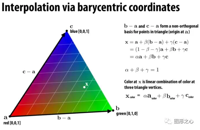 2、三角形是一个面,表面上的其他点采用的是三角形重心插值算法(barycentric算法)插值计算出来的,这部分是由GPU自动完成的。也就是说在vs端指定了3个顶点,通过GPU的插值会得到整个三角形的面,fs端收到的数据是插值后三角形面上的所有点的数据。