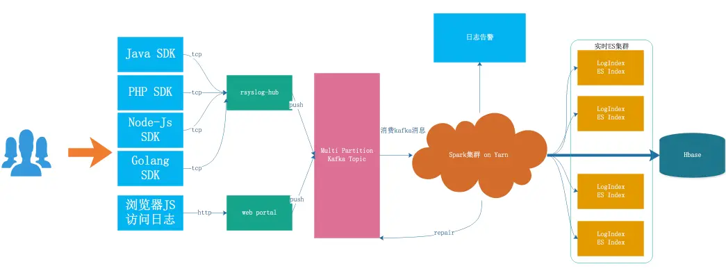-Http Web 服务接入:有些无法使用 SDk 接入日志的业务,可以通过 Http 请求直接发送到日志系统部署的 Web 服务,统一由 web protal 转发到日志缓冲层的 kafka 集群