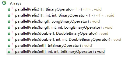 可以看到parallelPrefix提供了IntBinarryOperator接口接口的applyAsInt提供了left, right参数,根据left和right参数对数组进行修改,修改完成后将结果写入原数组。二元操作可以对long, int, double类型的数组进行操作,也可以对任意其他类型的数组进行操作,而且可以提供数组操作的下标范围。