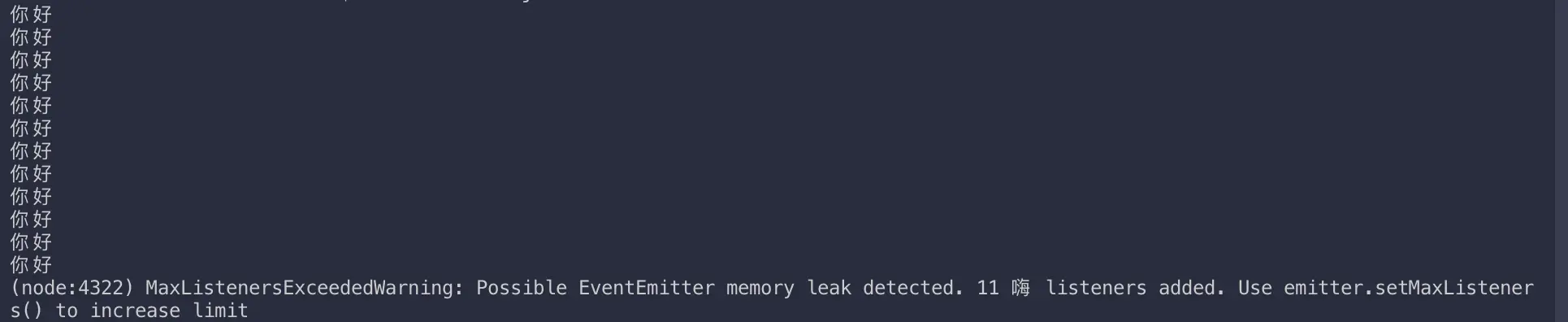 console.error('超过最大的监听数量可能会导致内存泄漏');