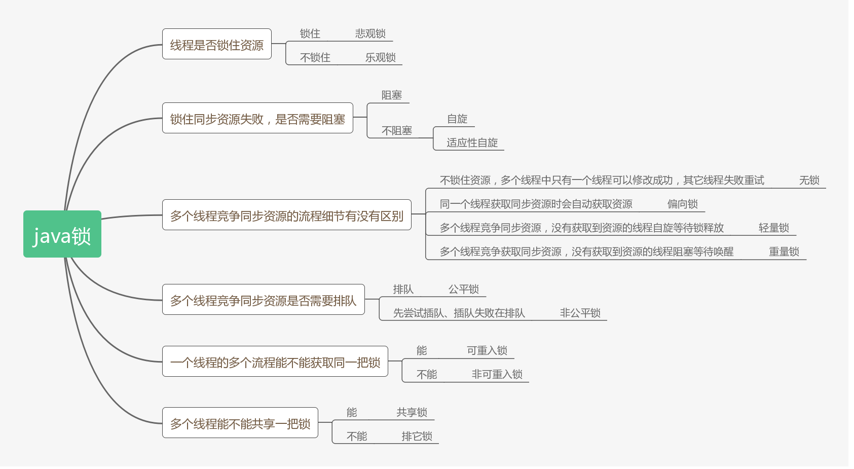介绍到这在Java中出现的一些锁的一些概念基本介绍完了,全是文字看着比较枯燥也是大家最不喜欢看的技术文章。下面画个思维导图来帮助大家记忆。