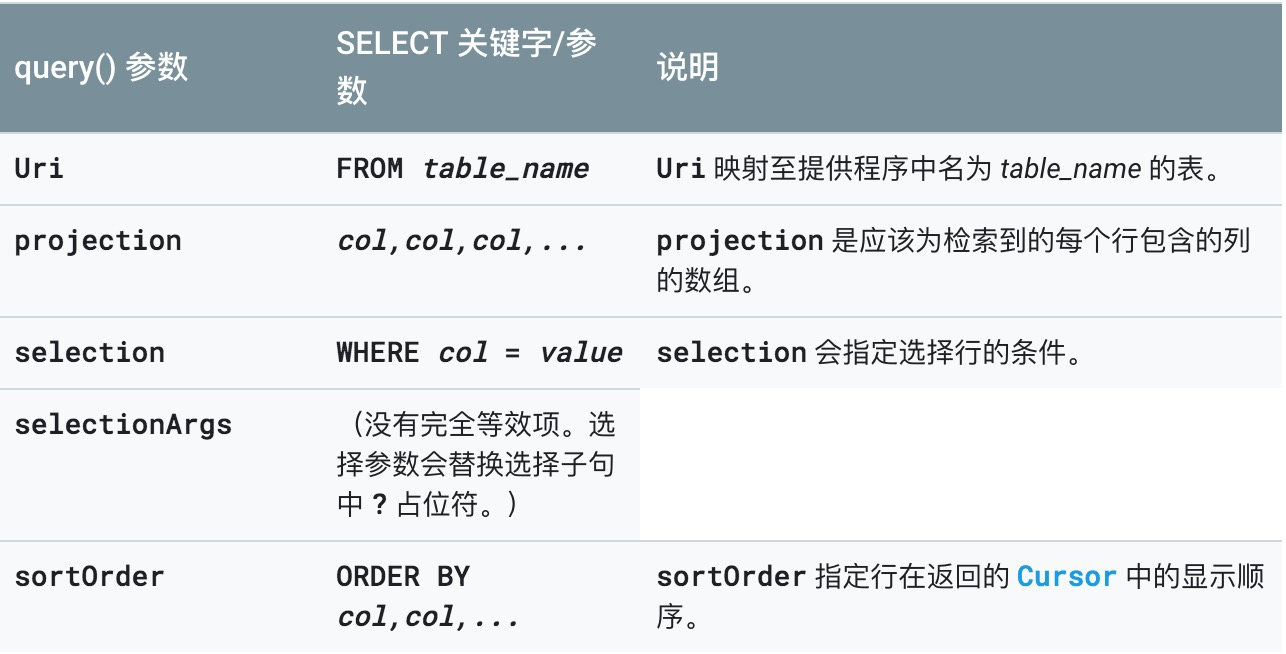 下一个代码段以用户字典提供程序为例,显示了如何使用 ContentResolver.query()。 提供程序客户端查询与 SQL 查询类似,并且包含一组要返回的列、一组选择条件和排序顺序。