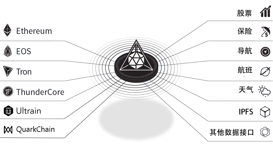 同时,DOS Network可支持各种主流区块链,如 Ethereum、EOS、TRON、ThunderCore 、Ultrain、QuarkChain等。而通过DOS Network这些公链可以获取现实世界的股票、天气、航班等各类信息。