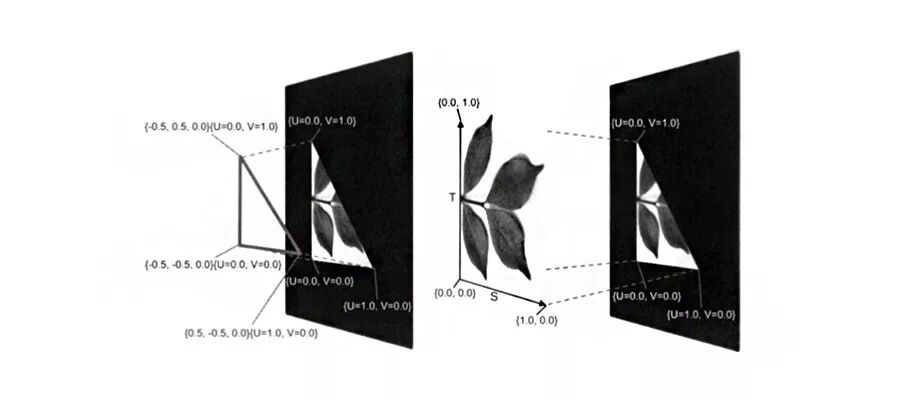 纹理坐标系的范围是 0 ~ 1,是一个二维坐标系,横轴称为 S 轴,纵轴称为 T 轴。在坐标系中,点的横坐标一般用 U 表示,点的纵坐标一般用 V 表示。左下角为 (0, 0),右上角为 (1, 1)。