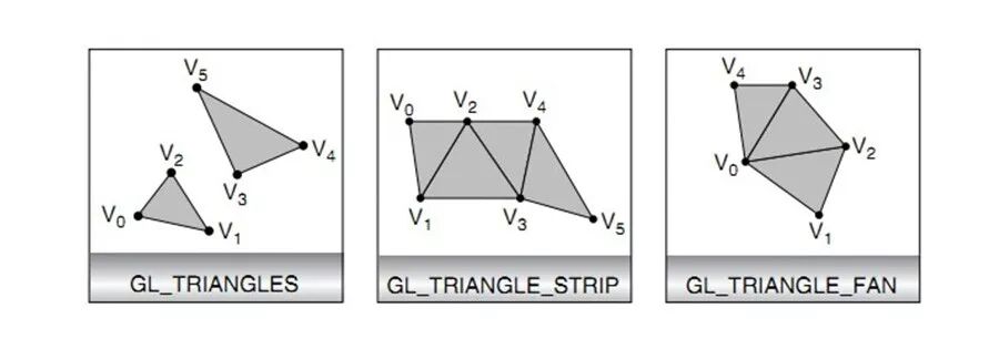 GL_TRIANGLES 就是我们一开始说的方式,没有复用顶点,以每三个顶点绘制一个三角形。第一个三角形使用 V0 、 V1 、V2 ,第二个使用 V3 、 V4 、V5 ,以此类推。如果顶点的个数不是 3 的倍数,那么最后的 1 个或者 2 个顶点会被舍弃。