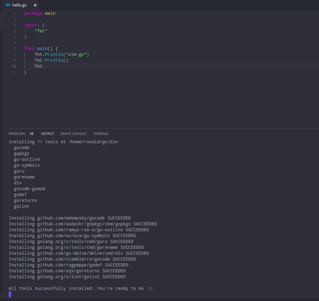 首先使用vscode打开任意一个go文件,然后在任意一行输入fmt.使vscode弹出安装提示,然后点击Install All即可开始安装。下图是安装成功的结果: