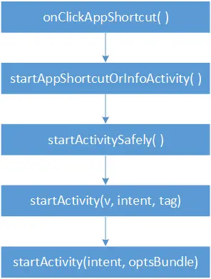 这里Launcher类继承自Activity,所以平常我们进入Android桌面看到的都是一个Activity组件,那么Activity所具有的特征Launcher也具有。在Launcher桌面上面每一个应用视图(图片+文字)其实都是一个BubbleTextView控件,BubbleTextView是一个继承自TextView的自定义控件,如果点击桌面icon则会执行onClickAppShortcut()方法,如下是点击桌面icon后一直到startActivity()执行流程。