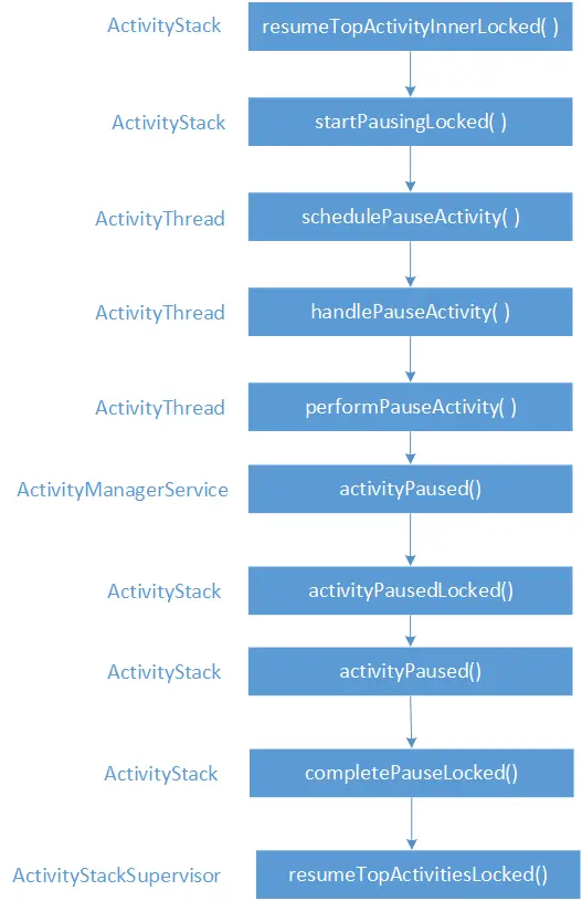 在startPausingLocked()方法中将当前Activity设置为prev变量,然后将mResumedActivity重置为null,mPausingActivity设置为当前Activity,并执行ActivityThread的schedulePauseActivity()方法。schedulePauseActivity()方法的执行逻辑类似前面介绍的scheduleLaunchActivity(),可以参考浅谈Activity的启动流程,经过一系列的执行最终执行到ActivityStackSupervisor类的resumeTopActivitiesLocked(),这时候就又重新进入了目标Activity的启动流程上面,并继续完成目标Activity的启动流程。