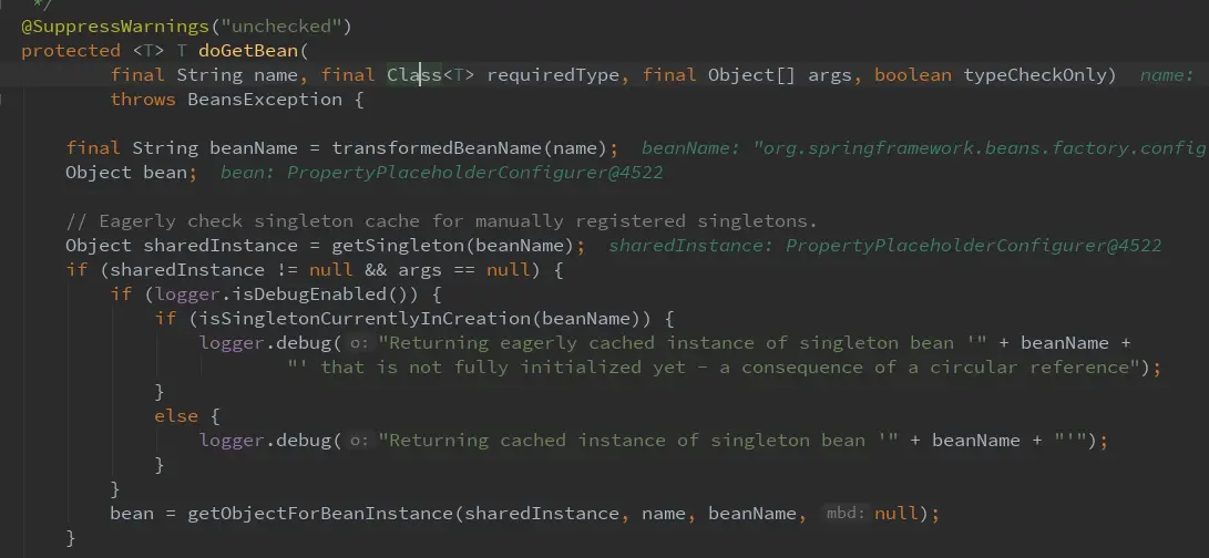 getBean进入doGetBean 下面四张图都是