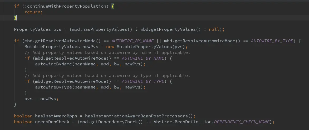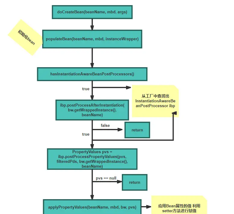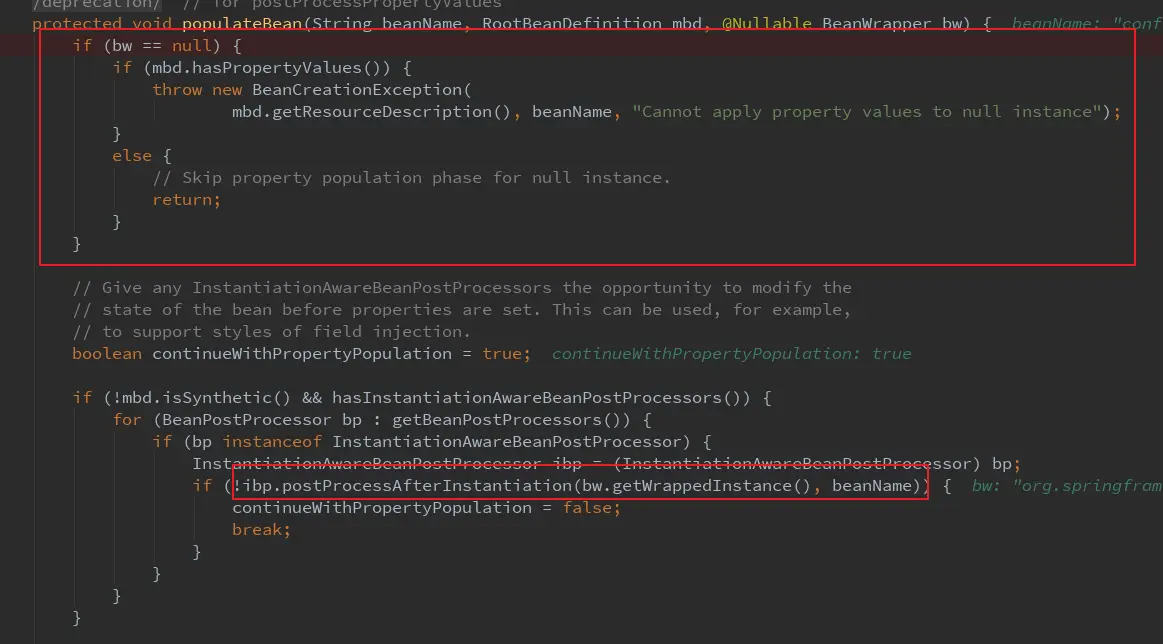 官方的解释是:让用户可以自定义属性注入。比如用户实现一 个 InstantiationAwareBeanPostProcessor 类型的后置处理器,并通过 postProcessAfterInstantiation 方法向 bean 的成员变量注入自定义的信息。当然,如果无 特殊需求,直接使用配置中的信息注入即可。另外,Spring 并不建议大家直接实现 InstantiationAwareBeanPostProcessor 接口,如果想实现这种类型的后置处理器,更建议 通过继承 InstantiationAwareBeanPostProcessorAdapter 抽象类实现自定义后置处理器